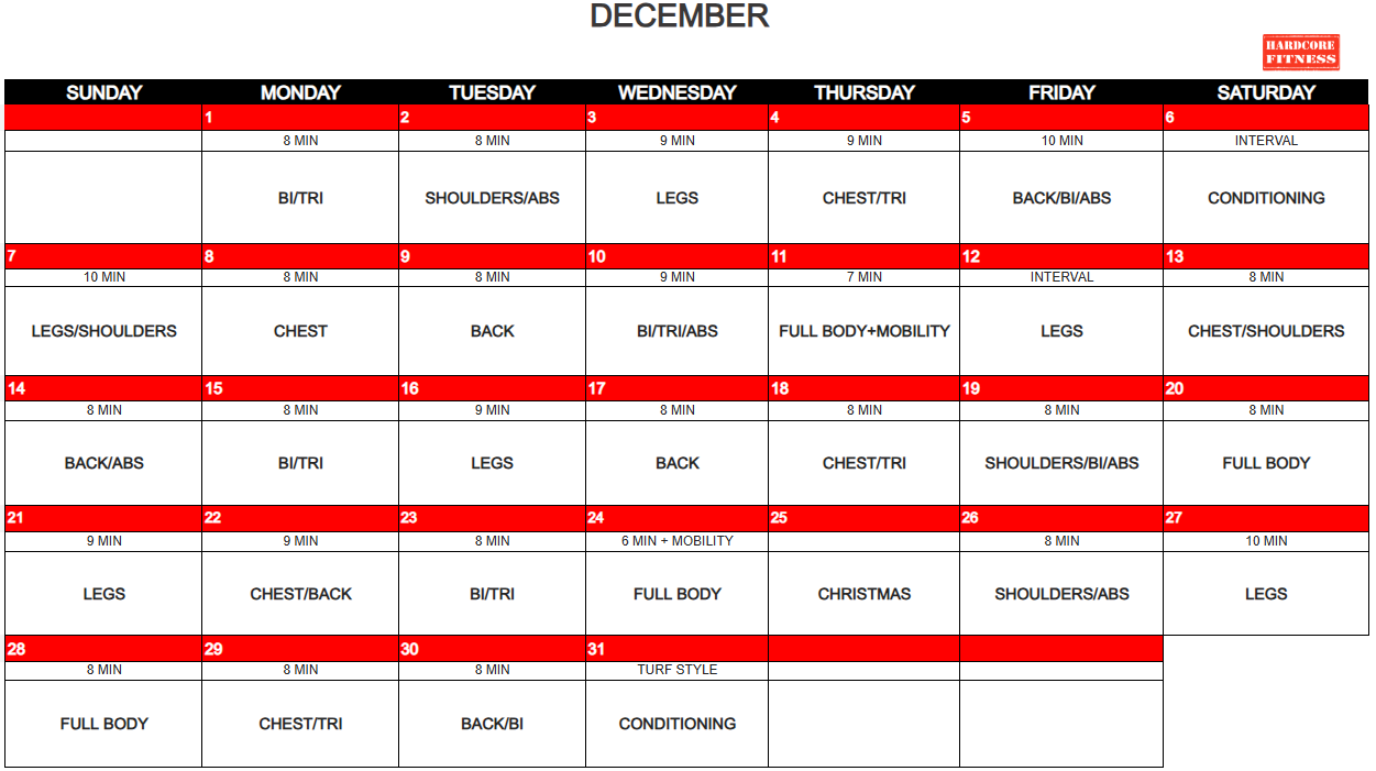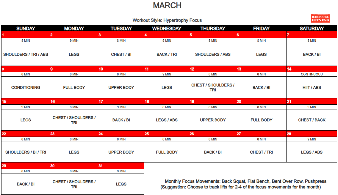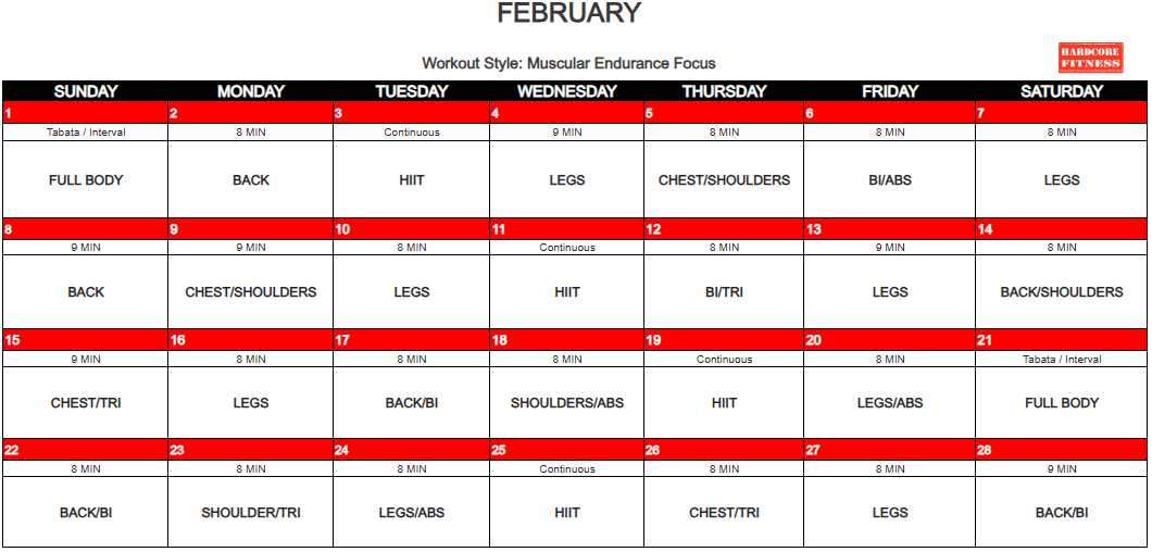 THE WORKOUT SPLIT CALENDAR LISTS THE PROGRAMMING STYLE FOR THE DAY
