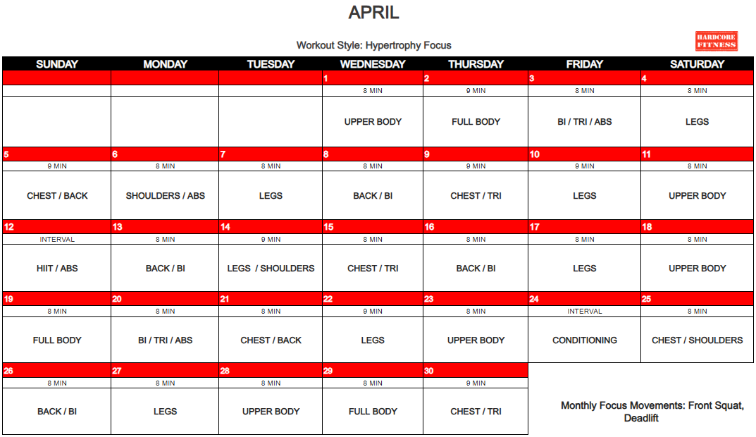 THE WORKOUT SPLIT CALENDAR LISTS THE PROGRAMMING STYLE FOR THE DAY