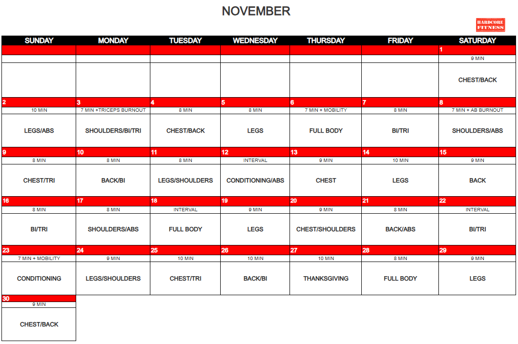THE WORKOUT SPLIT CALENDAR LISTS THE PROGRAMMING STYLE FOR THE DAY